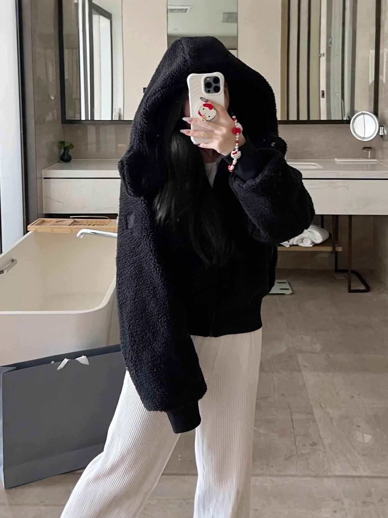 Women Sherpa Fleece Hooded Short Zip Up Jacket Soft Warm Winter Coat Cozy Puff Style Outerwear Comfortable Daily Wear for Autumn